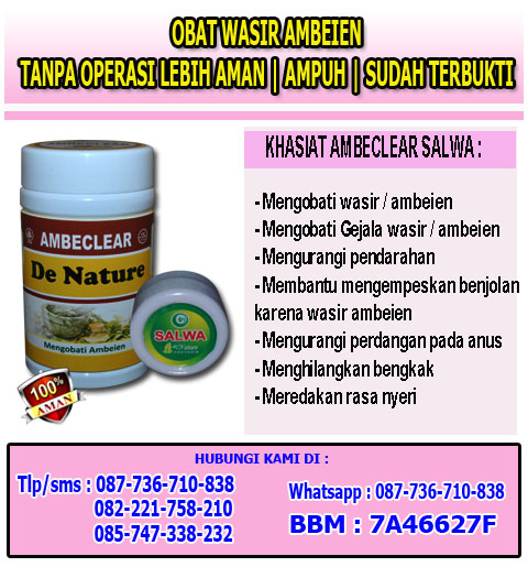Obat utk atasi ambeien tidak dengan butuh operasi - Trick mengobati & menyembuhkan wasir yg paling pas merupakan memakai AmbeClear De Nature yg benar-benar telah terbukti ampuh sembuhkan penderita ambeien atau wasir dalam (internal) & serta luar (eksternal) dgn serta-merta & aman tidak dengan resiko samping. diluar itu obat tradisional wasir atau ambeien ini pula tercatat resmi DINKES Republik Indonesia maka mampu dijamin terjamin kualitas & serta kualitasnya.